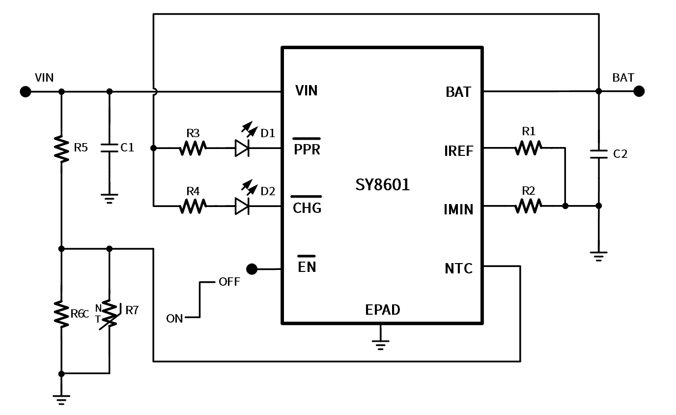 SY8601 is single-lithium battery linear-charging IC with integrated high voltage input. The charging is disabled when input voltage is higher than the protection threshold of 6.5V input maxim voltage up to 28V, it can work well without over-voltage protect circuit.