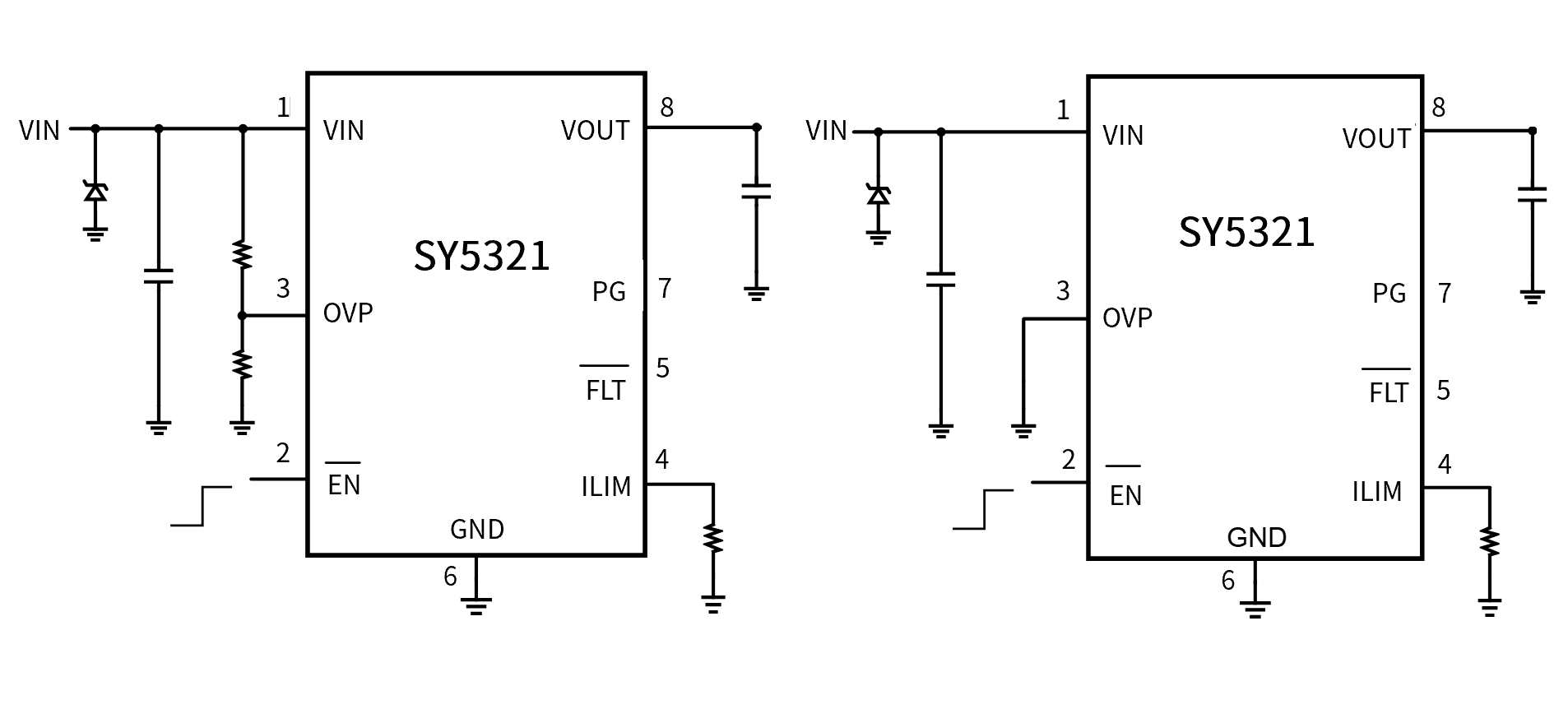 SY5321 is a highly integrated IC with input undervoltage and overvoltage protection, abnormal load current protection and over temperature protection. The SY5321 is used at the front end of charging circuits or low-voltage systems to protect the low-voltage system from abnormal input faults and can withstand abnormal input voltages up to 28V. SY5321 can use OVP pin to set the external input overvoltage threshold or the IC internal input overvoltage threshold. If the OVP pin voltage is higher than 0.6V, the IC will select the OVP threshold set by the external resistor partial voltage. If the OVP pin voltage is less than 0.15V, the IC will select the internal OVP threshold.