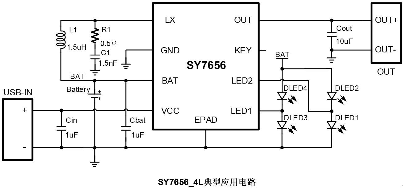 KEY鍵及LED指示,可訂制版本及功能——SY7656_2L:無需接KEY鍵,升壓常輸出,輕載自動(dòng)關(guān)閉LED顯示;2顆LED充/放電狀態(tài)指示; SY7656_KEY2L:單擊KEY鍵顯示電量并啟動(dòng)/關(guān)閉升壓,自動(dòng)關(guān)機(jī)功能(VOUT掉到0V);2顆LED充/放電狀態(tài)指示; SY7656_4L: 無需接KEY鍵,升壓常輸出,輕載自動(dòng)關(guān)閉LED顯示;4顆LED充/放電狀態(tài)指示; SY7656_KEY4L:單擊KEY鍵顯示電量并啟動(dòng)/關(guān)閉升壓,自動(dòng)關(guān)機(jī)功能(VOUT掉到0V);4顆LED充/放電狀態(tài)指示。
