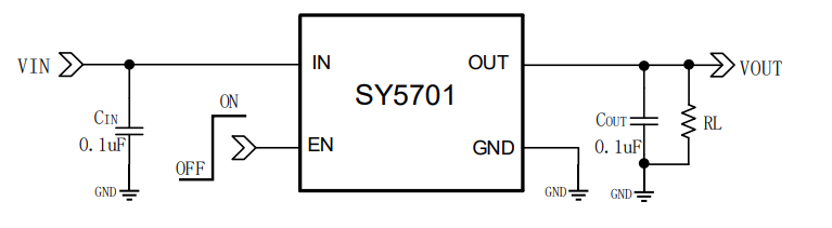 SY5701是一顆小型,低RON,超低功耗,快速開啟的load switch,最大支持1A電流。低于20nA的工作電流可支持應用在智能手表、手環(huán)等功耗敏感的設備上。SY5701包含1個60mΩ(典型應用)P溝道 MOSFET,可在1.1V至5.5V的輸入電壓下工作??赏ㄟ^EN腳控制開關,1V的較低控制電壓即可開啟開 關,支持1.2V I/O控制應用。EN腳內部有智能的下拉 電阻,在EN未拉高時,接入一個典型值為500kΩ的對地電阻,保證EN腳狀態(tài),EN腳升高狀態(tài)翻高時,斷開下拉電阻,保證低功耗。SY5701內部做了開啟速度控制,可在快速開啟的同時抑制浪涌電流。典型應用下輸出開啟時間為 100us。 SY5701采用FOCSP- 4封裝,面積0.76mm*0.76mm,0.4mm pitch,同時也支持DFN-1mm*1mm-4L小型封裝。