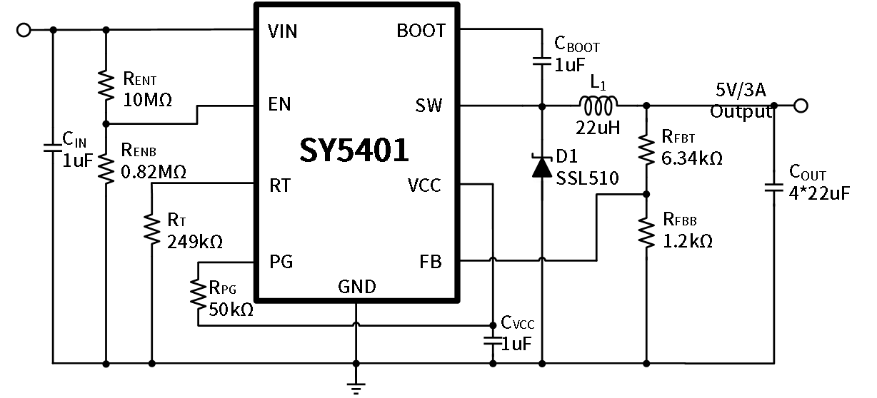The SY5401 develops a peak current mode control, asynchronous buck DC/DC converter capable of delivering 3A output current. The SY5401 operates over a wide input voltage