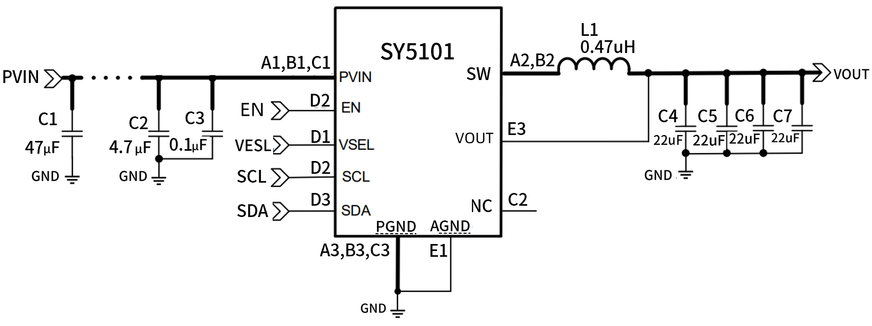 SY5101支持3A的輸出電流,且保持高達(dá)80%效率工作,在低電流時(shí)(<10mA),也能保證80%的轉(zhuǎn)化效率。SY5101在PWM模式下定頻工作在2.4MHz,較高的工作頻率可以使用較低感值電感,以滿(mǎn)足輸出電壓紋波與環(huán)路穩(wěn)定的要求,推介使用0.33uH或者0.47uH的電感。