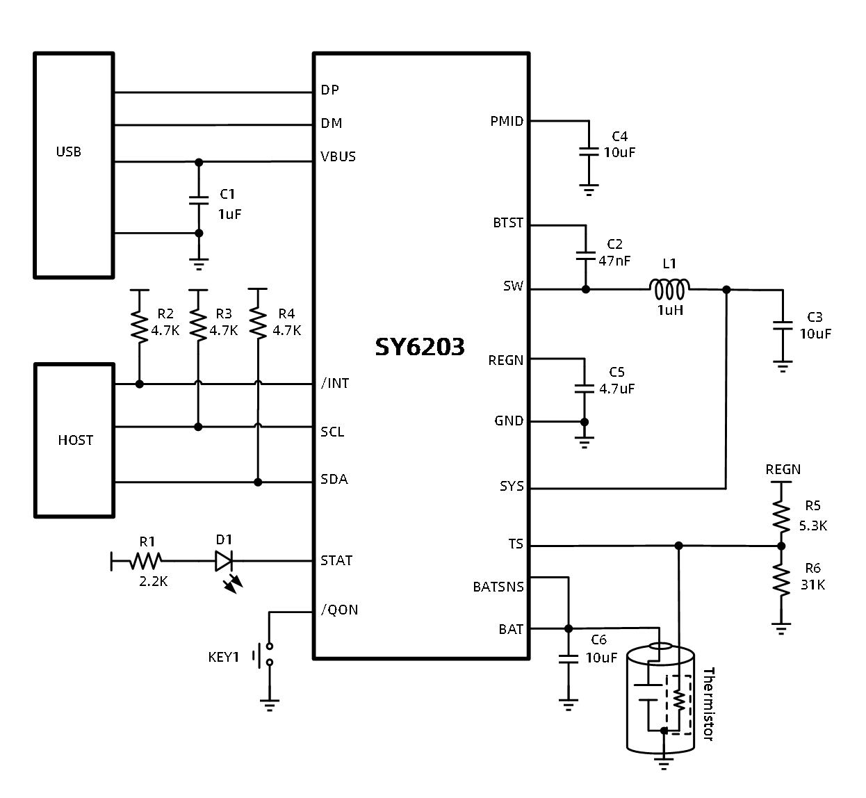 SY6203 is compatible with the BC1.2 and can automatically set the input current limit based on the input sources.